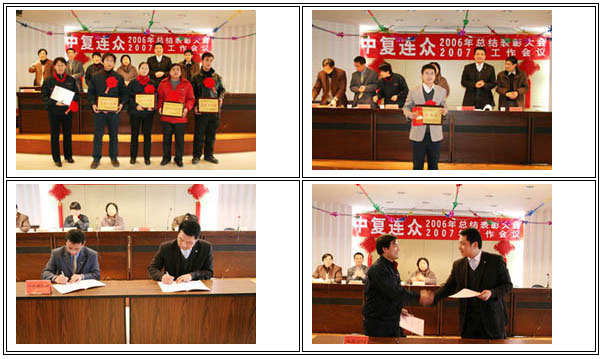 2007年元月31日下午,中復(fù)連眾2006年總結(jié)表彰大會暨2007年工作會議在集團公司辦公大樓五樓多功能廳召開,公司全體員工參加了會議。會上,喬光輝總經(jīng)理總結(jié)了2006年工作,布置了2007年工作任務(wù),陳立友主席宣讀了關(guān)于《表彰2006年度先進個人、標兵、先進集體的決定》,由集團公司領(lǐng)導(dǎo)頒發(fā)了獎金、獎牌。為了做好07年的工作,喬光輝總經(jīng)理同各子分公司、事業(yè)部簽訂2007年經(jīng)營責(zé)任書。最后,中復(fù)集團公司副總經(jīng)理、中復(fù)連眾集團黨委書記、董事長任總作了重要講話,由耿婷芳副總經(jīng)理作會議總結(jié)。圖為公司領(lǐng)導(dǎo)與各事業(yè)部主要負責(zé)人簽訂2007年經(jīng)營責(zé)任書與公司領(lǐng)導(dǎo)為標兵等頒獎的照片。