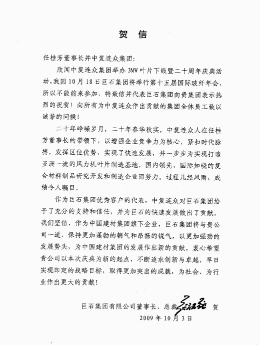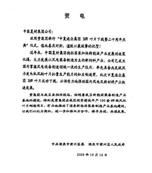 金秋十月,恰逢中復(fù)連眾3.0MW風(fēng)力機(jī)葉片暨二十周年。近日來(lái),江蘇省科技廳、甘肅酒泉肅州區(qū)委區(qū)政府、巨石集團(tuán)等單位發(fā)來(lái)賀信,對(duì)中復(fù)連眾表示祝賀。
