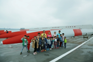 上午九點(diǎn)鐘,雖然天空飄著零星細(xì)雨,小朋友的熱情卻很高漲。大家統(tǒng)一乘坐大客車來(lái)到連云港葉片工廠,參觀一分廠、二分廠的辦公區(qū)域,葉片貨場(chǎng),檢測(cè)中心和12兆瓦試驗(yàn)臺(tái)。大人們平時(shí)司空見(jiàn)怪的風(fēng)景,在小朋友充滿好奇的眼里,一切都變得不同。一只只巨大的銀色葉片,靜靜地躺在貨場(chǎng)上,像一架架等候起飛的飛機(jī);12兆瓦試驗(yàn)臺(tái),兩只正在進(jìn)行加載試驗(yàn)的葉片,像一個(gè)巨大的變形金剛,抖動(dòng)著翅膀,隨時(shí)準(zhǔn)備變身。