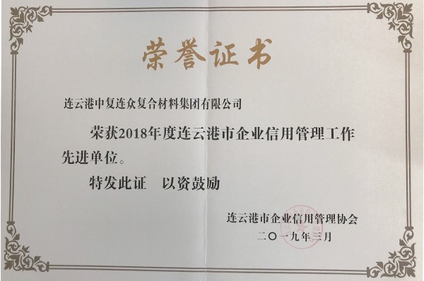 3月21日,連云港市企業(yè)信用管理協會對榮獲2018年度市級“信用管理先進單位”進行表彰并舉行授牌儀式,中復連眾榜上有名。