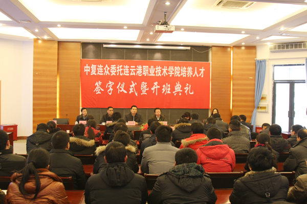 2月25日,中復連眾委托連云港職業(yè)技術學院培養(yǎng)人才簽字儀式暨開班典禮隆重舉行。中復連眾總經(jīng)理喬光輝、連云港職業(yè)技術學院副院長駱汝九、學院教師代表和全體學員出席儀式。